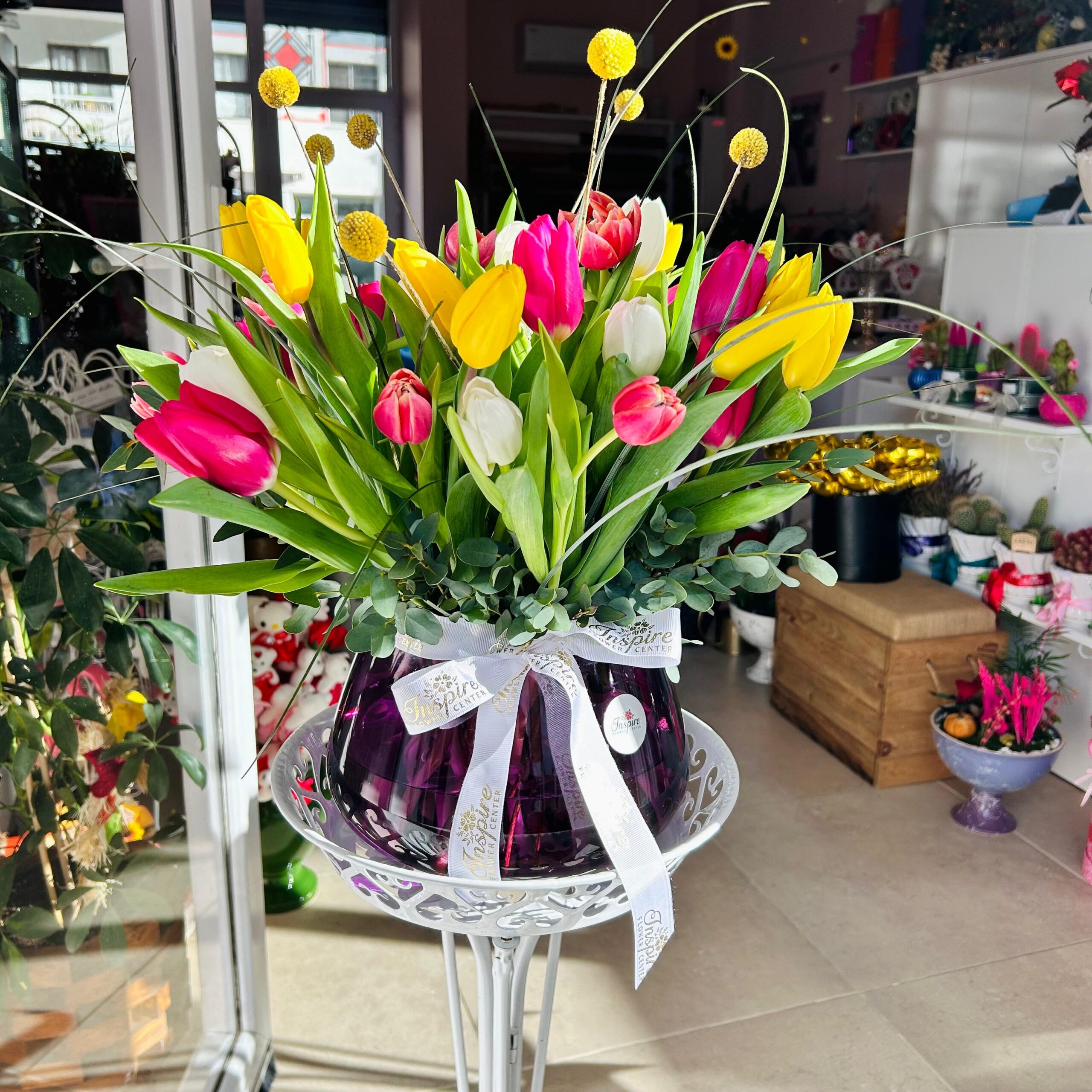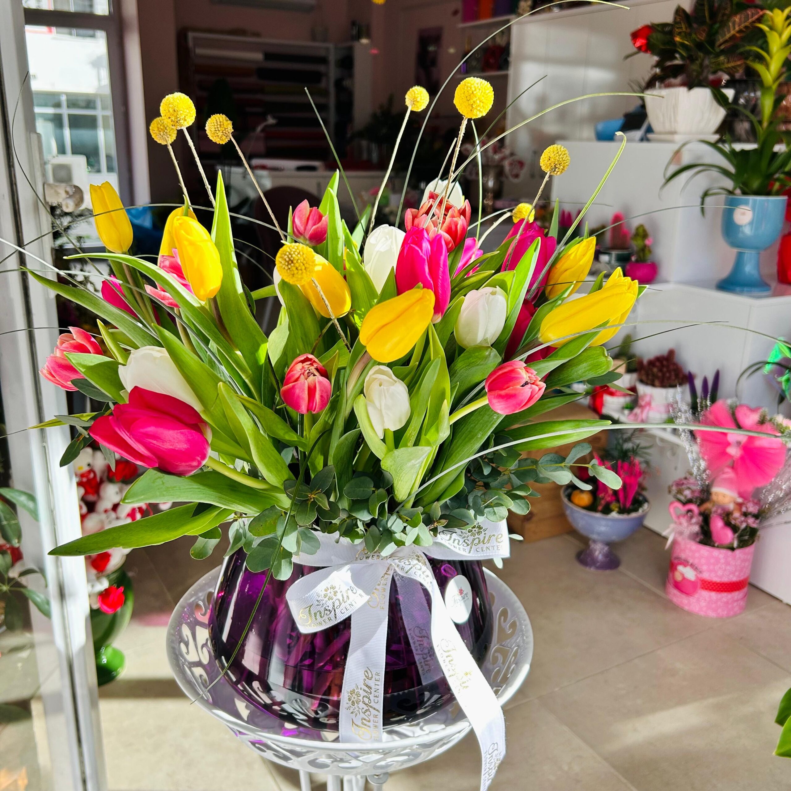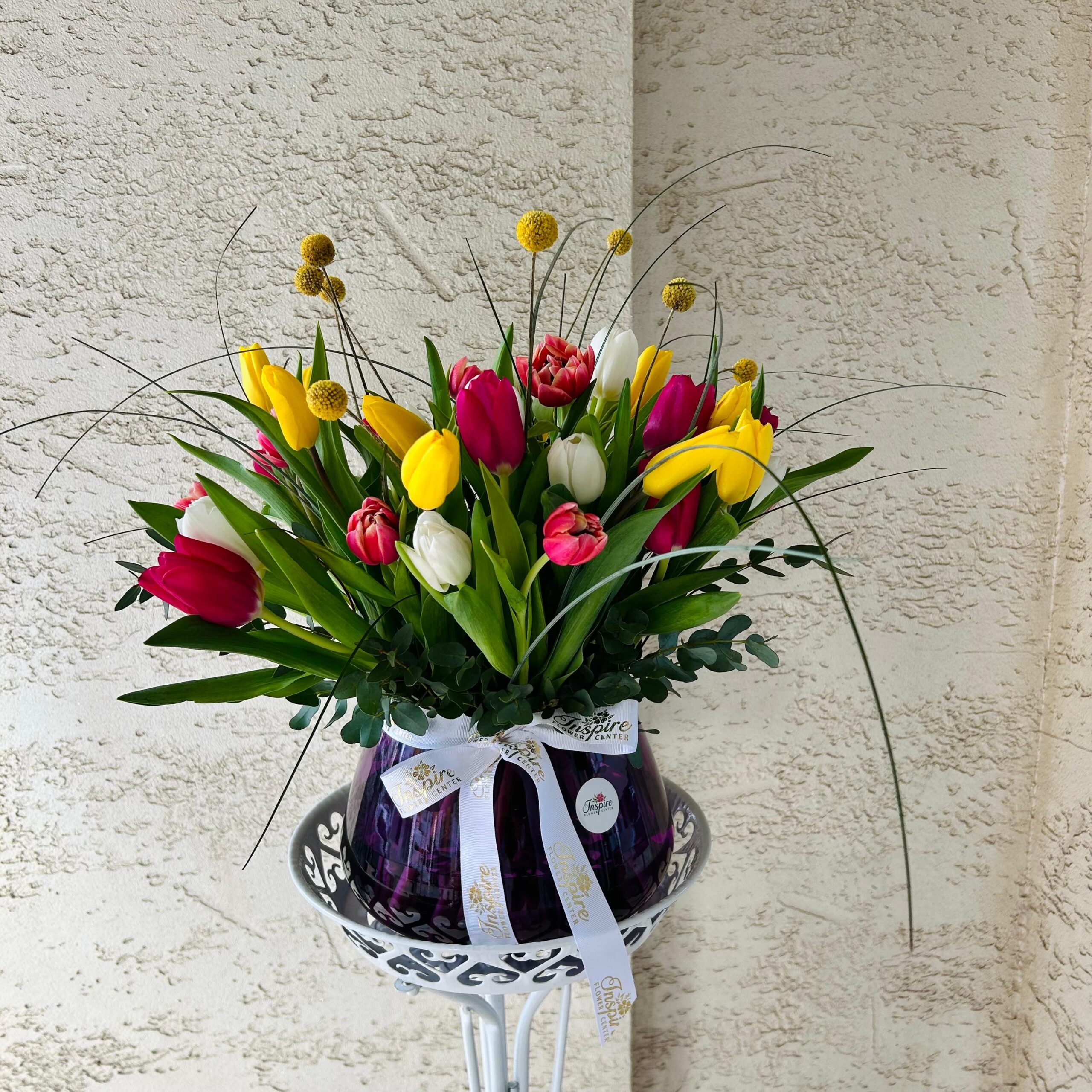 41 Adet Cam Fanusta Renkli Lale Aranjmanı